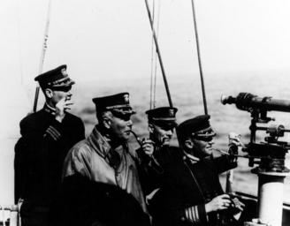 | Keywords: blackandwhite monochrome black and white NH 75768: USS Bruce (DD-329). Officers on the ship's open bridge, during engineering, gunnery and torpedo exercises in early 1921. Those present are (from left to right): Commander Henry C. Gearing, Jr., Commanding Officer, USS Bruce; Captain William V. Pratt, Commander, Destroyer Force, Pacific Fleet; Lieutenant Homer L. Grosskopf, Executive Officer, USS Bruce; and Captain Franck Taylor Evans, Chief of Staff, Destroyer Force, Pacific Fleet. Note pelorus at right and cigarettes and pipes in use. Courtesy of the Naval Historical Foundation. Collection of Admiral William V. Pratt. Naval History and Heritage Command (2016/04/04). NH 75768: USS Bruce (DD-329). Officers on the ship's open bridge, during engineering, gunnery and torpedo exercises in early 1921. Those present are (from left to right): Commander Henry C. Gearing, Jr., Commanding Officer, USS Bruce; Captain William V. Pratt, Commander, Destroyer Force, Pacific Fleet; Lieutenant Homer L. Grosskopf, Executive Officer, USS Bruce; and Captain Franck Taylor Evans, Chief of Staff, Destroyer Force, Pacific Fleet. Note pelorus at right and cigarettes and pipes in use. Courtesy of the Naval Historical Foundation. Collection of Admiral William V. Pratt. Naval History and Heritage Command (2016/04/04). |