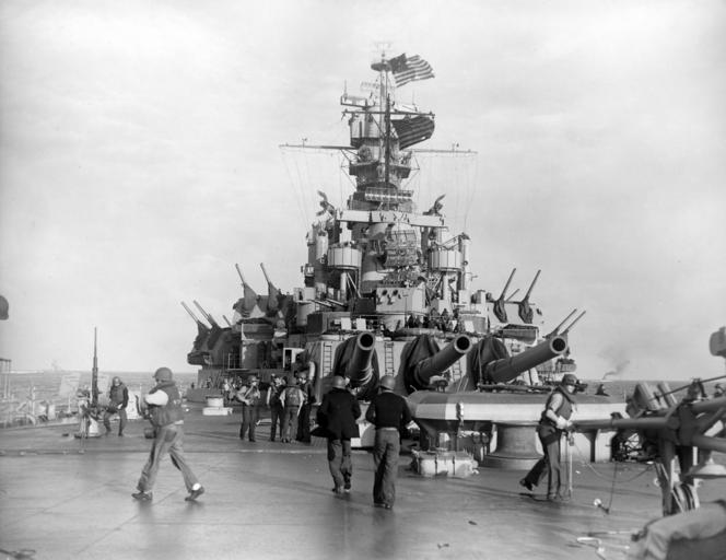 | Keywords: blackandwhite monochrome vehicle outdoor black and white NH 84534: USS Massachusetts (BB-59). View looking forward from the ship's after deck, during a lull in the Battle of Casablanca, 8 November 1942. Note: 16"/45 guns of her after turret; 20mm gun at left with "Lead, Dammit, Lead" printed on its shield; FC & FD radar antennas atop her gun directors; two large National Ensigns flying from her masts. Collection of Rear Admiral Clifford Van Hook, 1972. U.S. Naval History and Heritage Command Photograph. (2016/02/10). NH 84534: USS Massachusetts (BB-59). View looking forward from the ship's after deck, during a lull in the Battle of Casablanca, 8 November 1942. Note: 16"/45 guns of her after turret; 20mm gun at left with "Lead, Dammit, Lead" printed on its shield; FC & FD radar antennas atop her gun directors; two large National Ensigns flying from her masts. Collection of Rear Admiral Clifford Van Hook, 1972. U.S. Naval History and Heritage Command Photograph. (2016/02/10). |
