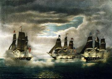 | Keywords: surreal outdoor NH 86692-KN (color). "Capture of H.M. Ships Cyane & Levant, by the U.S. Frigate Constitution", 20 February 1815. Lithograph by James Queen after a painting by Thomas Birch, published circa the mid-19th Century by P.S. Duval, Philadelphia, Pennsylvania. It depicts the American frigate engaging Levant (at left) and Cyane (at right). Constitution was commanded by Captain Charles Stewart. Courtesy of the U.S. Navy Art Collection, Washington, D.C. U.S. Naval History and Heritage Command Photograph. NH 86692-KN (color). "Capture of H.M. Ships Cyane & Levant, by the U.S. Frigate Constitution", 20 February 1815. Lithograph by James Queen after a painting by Thomas Birch, published circa the mid-19th Century by P.S. Duval, Philadelphia, Pennsylvania. It depicts the American frigate engaging Levant (at left) and Cyane (at right). Constitution was commanded by Captain Charles Stewart. Courtesy of the U.S. Navy Art Collection, Washington, D.C. U.S. Naval History and Heritage Command Photograph. |