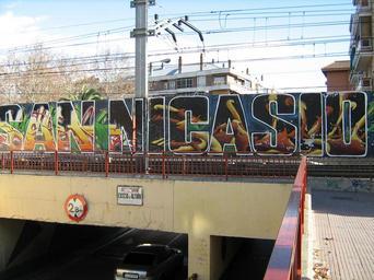 Keywords: Nicasio27.jpg es Mural en la tapia que delimita la vía del ferrocarril de cercanías C-5 en la salida del barrio de San Nicasio Leganés Comunidad de Madrid own Chaluco San Nicasio Leganés Rail transport in Leganés Railway lines in the Community of Madrid |