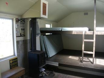 Keywords: Nichols hut 4.jpg Nichols hut W Tararua Range Tararua ; stove and bunks 2016-01-06 Own Sarang Nichols Hut