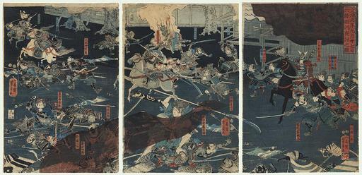 | Keywords: Night attack at Horikawa.jpg  en Japanese Edo period wood block print of the famous night attack on Horikawa Castle where Minamoto no Yoshitsune sought refuge from his brother Yoritomo who eventually killed him in his quest to become absolute ruler of Japan The scene is one of chaos as samurais clash on foot and on horseback battling with swords and naginata as smoke and flames engulf the palace In the center a young warrior stands atop a fallen enemy gripping his weapon with both hands as he faces the attackers At right a general in a horned battle helmet directs his men with a tasseled command baton The ground is littered with broken arrows standards and abandoned weapons A dramatic night scene with wonderful detail in the expressive faces and setting Japanese Edo period wood block print book Yoshikazu 1800's PD-Japan Historic samurai prints PD-old-100  |