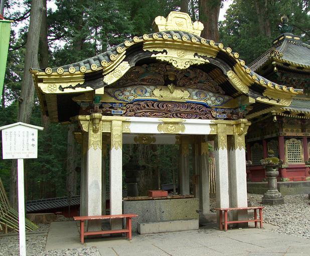 | Keywords: NikkoChozusha4949.jpg Chozusha building with basin for washing one's hands and mouth before entering the shrine precincts at Toshogu Nikko Tochigi Prefecture Japan a UNESCO World Heritage Site The curved roof form is a classic Japanese feature called a karahafu I took the photo and contribute it to the public domain However people and institutions may retain rights to images in it Kara-hafu Nikkō Tōshō-gū Chōzuya Roof forms zz Japan | ||||