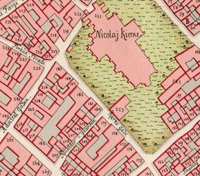 Keywords: Nikolaj Kirke (Gedde).jpg en The Nikolaj Plads site as seen on Gedde's district map of Copenhagen Denmark 1757 http //www indenforvoldene dk/nedlagte 20gader 20og 20straeder html Christian Gedde other versions PD-old Nikolaj Plads Christian Gedde