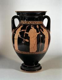 | Keywords: Niobid Painter - Red-Figure Amphora with Musical Scene - Walters 482712 - Side B.jpg One of the prominent painters of classical Athens the Niobid Painter named after his most famous vase is admired for his quiet and balanced compositions Here in the women's quarters of a house three elaborately dressed women prepare for a music session A seated woman relaxes while fingering a barbiton a stringed instrument Above her head hangs a lyre She faces a woman holding double flutes and a third woman lifts the lid of a box The scene evokes the leisured and relatively educated world of affluent Athenian women On the back women dressed in the attire of maenads the female followers of Dionysus hold pine branches and a torch; these may be the same women now preparing for their ritual roles in Dionysus' cult between 460 450 BC Classical terracotta cm 44 7 30 3 h x diam accession number 48 2712 15642 Raymond Duncan 1874-1966 brother of Isadora Duncan Dorée Duncan Seligmann granddaughter of Raymond Duncan by inheritance Robert E Hecht Jr New York 1961 mode of acquisition unknown Walters Art Museum 1993 by purchase Museum purchase 1993 Pandora's Box Women in Classical Greece The Walters Art Gallery Baltimore; Dallas Museum of Art Dallas; Antikenmuseum Basel und Sammlung Ludwig Basel 1995-1996 Highlights from the Collection The Walters Art Gallery Baltimore 1998-2001 place of origin Attica Greece Walters Art Museum license Ancient Greek red-figure pottery in the Walters Art Museum Niobid Painter Media contributed by the Walters Art Museum needs category review Maenads in ancient Greek pottery |