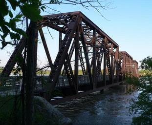 Keywords: Niobrara State Park bridge from SW.JPG Niobrara River Bridge near the mouth of the Niobrara in Knox County Nebraska ; seen from the southwest upstream The bridge was built in 1929 to carry the Chicago and North Western Railroad across the Niobrara immediately upstream from its confluence with the Missouri It consists of three rigid-connected Warren through truss spans at the west end then seven steel plate through girders then 29 timber stringer approach spans over the floodplain to the east It is now a part of Niobrara State Park where it serves as a footbridge The bridge is listed in the National Register of Historic Places own 2010-05-08 Ammodramus Pictures by Ammodramus Taken with Panasonic Lumix DMC-FZ20 Niobrara State Park bridge |