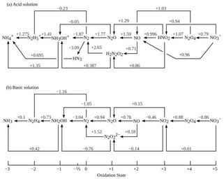 | Keywords: Nitrogen electrode potentials.svg en Shows the oxidation states of nitrogen and summarizes standard reduction potentials in volts Top diagram shows acid solution at pH 0; bottom shows basic solution at pH 14 Vector version of diagram from Cite book Chemistry of the Elements Greenwood Norman N Earnshaw Alan Butterworth-Heinemann 1997 0-08-037941-9 437 Original Diagram Norman N Greenwood and Alan Earnshaw Vectorization by AntiCompositeNumber 1997 en File Nitrogen electrode potentials png v en image SVG diagrams in English SVG chemistry Cc-zero |