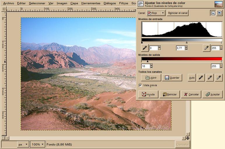 Keywords: Niveles de color.jpg Ejemplo de nivelacion de color en Gimp own 2007-01-30 Jesus Angel Rey Color in computer graphics Spanish GIMP screenshots