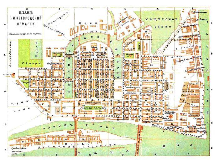 Keywords: NizhegYarmarkaPlan.jpg План ижего одской я ма ки XIX века Plan of Nizhniy Novgorod's fair of XIXth century Обозначения Bd Пожа ное депо Bd Часовня К естовоздвиженского монасты я Cd а одные столовая и чайные Cd ака ьевская флачная часовня Са П истань Dcd Пассаж ижего одского ечного училища Dd Часовня Пече ского монасты я Dd Би жа Ed П истань Ed Александ о- евский собо Dc Теат Dc Б азильский пассаж Da Ци к Eа а одные увеселения Db ечеть Db Ка аван-са ай Cb Ста ый я ма очный собо Bb А мянская це ковь Ac Пожа ное депо и полицейская часть Вс Гауптвахта Db Азиатская обувь CDb Буха ский и текинский това Ес Валяная обувь ва ежки Вс Вата Ecd Вина Сbс Галанте ейный това Ес Г ибы сушеные ABCde Железо Ed Железные и стальные изделия Сс Золото се еб о б онза Dd Иконы и киоты Cd Инст ументальный яд Ccd Книжный и бумажный това Db Ков ы азиатские Dd Ков ы тюменские Кожи и кожевенные изделия Во многих местах я ма ки Fd Колокола Dcd Колониальный и бакалейный това Fd Ложка ный яд Cbc Льняные изделия Ed Лес ободья огожи Bcd оскательный това Dc ыло Db Пе сидский това Сс Платье готовое Ecd П оволочные изделия Cdc П яжа и нитки Пушной това Во многих местах я ма ки Bcd Рыба Eb Ста ые вещи платье Ed Стекло фаянс Dd Сундуки CDb Сукна Dc Табак Bd Т анспо тные конто ы Cb Хлопок Хлопчатобумажные изделия Во многих местах я ма ки Ccd Чай и саха Сс Шелковые изделия Dc Шубы Dc Экипажи ЭСБЕ http //www cultinfo ru/fulltext/1/001/006/b41_044-0 jpg PD-old Maps of Nizhny Novgorod Fair