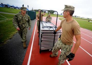 | Keywords: NMCB 3 'Silent Heroes' provide KSO enthusiastic, critical support 131104-N-TD630-002.jpg en Seabees from Naval Mobile Construction Battalion 3 finish setting up tables before the kickoff of the 14th Annual Kadena Special Olympics Volunteers from Naval Mobile Construction Battalion 3 helped both prepare for the 14th Annual Kadena Special Olympics and cheered on athletes the day of the event The KSO was established by the 18th Wing commander in 1999 as an avenue to build relations with neighboring communities and local government representatives while providing a meaningful activity for the special needs children and adults The event has grown from approximately 100 athletes to more than 1 300 athletes and artists The program reaches out to more than 77 schools and special needs workshops throughout the island Through KSO both American and Japanese athletes had the opportunity to compete in the national games and world games NMCB 3's main body is deployed to Okinawa but has nine other details performing critical construction projects in remote island areas such as Timor-Leste Tonga Cambodia and the Philippines The teams will also conduct operations in Atsugi Yokosuka and Okinawa Japan; Chinhae Republic of Korea and China Lake Calif The naval construction force is a vital component of the U S maritime strategy They provide deployable battalions capable of providing disaster preparation and recovery support humanitarian assistance and combat operations support U S Navy photo by Builder Constructionman Laine Pulfer Naval Mobile Construction Battalion 3 Public Affairs 2013-11-04 Seaman Laine Pulfer https //www dvidshub net/image/1048341 131104-N-TD630-002 2013-11-07 00 55 OKINAWA JP PD-USGov-Military-Navy Naval Mobile Construction Battalion 3 Images from DoD uploaded by Fæ |