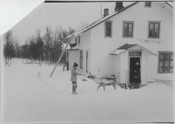 Keywords: wessel ellisif preus museum preusmuseum architecture building blackandwhite snow monochrome outdoor black and white Wessel, Ellisif Rannveig Mann med reinsdyr foran hus på Solheim. NMFF.002130 Wessel, Ellisif Rannveig Mann med reinsdyr foran hus på Solheim. NMFF.002130
