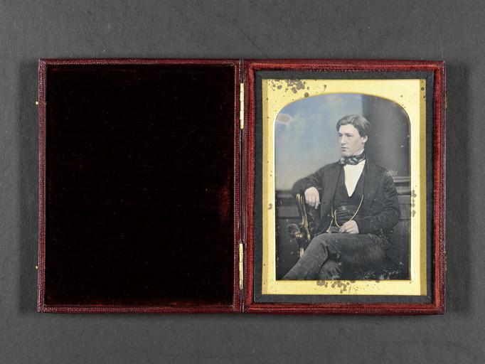 | Keywords: picture frame people indoor text William Edward Kilburn (|1818-91), London: Portrait of a young man sitting, ca 1850s, colored, daguerreotype in case. William Edward Kilburn (|1818-91), London: Portrait of a young man sitting, ca 1850s, colored, daguerreotype in case. |