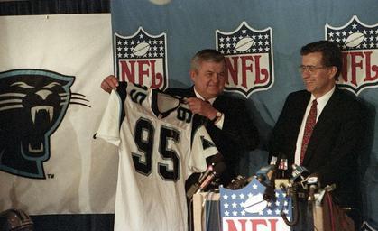| Keywords: Jerry and Mark Richardson with Carolina Panthers NFL shirts and logo, Rosemont, IL, October 27, 1993. At the league meeting in Chicago the day before (on October 26, 1993), NFL owners unanimously selected the Carolinas as the 29th NFL franchise and the first expansion team since 1976. From the News and Observer Negative Collection, State Archives of North Carolina, Raleigh, NC. Copyright owned by The Raleigh News & Observer newspaper. DO NOT USE OR PUBLISH WITHOUT EXPRESSED PERMISSION FROM THE N&O. Jerry and Mark Richardson with Carolina Panthers NFL shirts and logo, Rosemont, IL, October 27, 1993. At the league meeting in Chicago the day before (on October 26, 1993), NFL owners unanimously selected the Carolinas as the 29th NFL franchise and the first expansion team since 1976. From the News and Observer Negative Collection, State Archives of North Carolina, Raleigh, NC. Copyright owned by The Raleigh News & Observer newspaper. DO NOT USE OR PUBLISH WITHOUT EXPRESSED PERMISSION FROM THE N&O. |