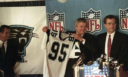| Keywords: Jerry and Mark Richardson with Carolina Panthers NFL shirts and logo, Rosemont, IL, October 27, 1993. At the league meeting in Chicago the day before (on October 26, 1993), NFL owners unanimously selected the Carolinas as the 29th NFL franchise and the first expansion team since 1976. From the News and Observer Negative Collection, State Archives of North Carolina, Raleigh, NC. Copyright owned by The Raleigh News & Observer newspaper. DO NOT USE OR PUBLISH WITHOUT EXPRESSED PERMISSION FROM THE N&O. Jerry and Mark Richardson with Carolina Panthers NFL shirts and logo, Rosemont, IL, October 27, 1993. At the league meeting in Chicago the day before (on October 26, 1993), NFL owners unanimously selected the Carolinas as the 29th NFL franchise and the first expansion team since 1976. From the News and Observer Negative Collection, State Archives of North Carolina, Raleigh, NC. Copyright owned by The Raleigh News & Observer newspaper. DO NOT USE OR PUBLISH WITHOUT EXPRESSED PERMISSION FROM THE N&O. |