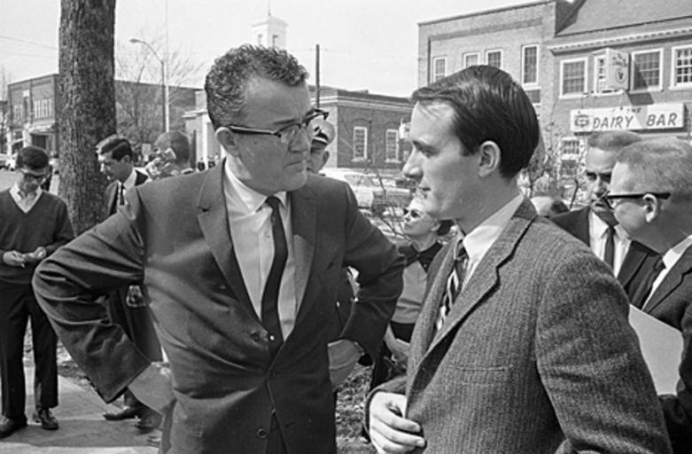 Keywords: blackandwhite monochrome black and white On June 26, 1963, the North Carolina General Assembly passed the Act to Regulate Visiting Speakers, later known as the Speaker Ban Law. The law forbade anyone to speak on a University of North Carolina campus who was a known member of the Communist Party, was known to advocate overthrow of the United States Constitution, or had invoked the Fifth Amendment in respect of communist or "subversive" connections. The law was rushed through in the closing hours of the legislative session with virtually no debate. Governor Terry Sanford was against the Speaker Ban bill, but at that time the governor of North Carolina could not veto legislation. In the wake of the passage of this law, the communities on the UNC campuses rose up in protest. Students, faculty, and community members protested the law and what it represented over the course of the next several years. A number of complex issues involving many key North Carolina political figures and national leaders kept the controversy very active and widely debated through the mid-1960's. In 1965, the North Carolina General Assembly established a commission to look into the consequenses of the law and recommend either ammedment or repeal of the law. The commission held public hearings in August and September of 1965 and in November amended the law absolving the state legislature from having to make rulings on who could speak on campuses and who could not and returning effective control over those issues to the universities. (Speaker Ban Law Study Commission records are held by the State Archives of North Carolina; finding aid is online www.archives.ncdcr.gov/findingaids/pdf/sa_speaker_ban_law...). In 1966 students at the University of North Carolina at Chapel Hill led by Student Body President Paul Dickson invited Herbert Aptheker and Frank Wilkinson ('known' Communists) to speak on the campus. As expected, the university refused to allow either of the speakers to give their speeches on campus. Instead, they addressed the assembled crowd on March 2, 1966, from across the stone wall that separates the university from the town of Chapel Hill. Ultimately a federal law suit against the university and the State of North Carolina was filed by UNC students. On February 19, 1968, after two years of consideration by the Federal District Court in Greensboro, Dickson, et al. v Sitterson, et al. was decided for the plaintiffs -- the court's opinion found the Speaker Ban law and policy unconstitutional. For more information on the Speaker Ban Law, its complexities, and surrounding events, please see this online exhibit and collection www.lib.unc.edu/mss/exhibits/protests/ban.html, NCpedia entry ncpedia.org/speaker-ban-law, and www.northcarolinahistory.org/commentary/187/entry/, used in the drafting of the above description of this set of images. COPYRIGHTED BY THE RALEIGH NEWS AND OBSERVER NEWSPAPER. DO NOT USE OR PUBLISH WITHOUT EXPRESSED CONSENT FROM THE N&O. On June 26, 1963, the North Carolina General Assembly passed the Act to Regulate Visiting Speakers, later known as the Speaker Ban Law. The law forbade anyone to speak on a University of North Carolina campus who was a known member of the Communist Party, was known to advocate overthrow of the United States Constitution, or had invoked the Fifth Amendment in respect of communist or "subversive" connections. The law was rushed through in the closing hours of the legislative session with virtually no debate. Governor Terry Sanford was against the Speaker Ban bill, but at that time the governor of North Carolina could not veto legislation. In the wake of the passage of this law, the communities on the UNC campuses rose up in protest. Students, faculty, and community members protested the law and what it represented over the course of the next several years. A number of complex issues involving many key North Carolina political figures and national leaders kept the controversy very active and widely debated through the mid-1960's. In 1965, the North Carolina General Assembly established a commission to look into the consequenses of the law and recommend either ammedment or repeal of the law. The commission held public hearings in August and September of 1965 and in November amended the law absolving the state legislature from having to make rulings on who could speak on campuses and who could not and returning effective control over those issues to the universities. (Speaker Ban Law Study Commission records are held by the State Archives of North Carolina; finding aid is online www.archives.ncdcr.gov/findingaids/pdf/sa_speaker_ban_law...). In 1966 students at the University of North Carolina at Chapel Hill led by Student Body President Paul Dickson invited Herbert Aptheker and Frank Wilkinson ('known' Communists) to speak on the campus. As expected, the university refused to allow either of the speakers to give their speeches on campus. Instead, they addressed the assembled crowd on March 2, 1966, from across the stone wall that separates the university from the town of Chapel Hill. Ultimately a federal law suit against the university and the State of North Carolina was filed by UNC students. On February 19, 1968, after two years of consideration by the Federal District Court in Greensboro, Dickson, et al. v Sitterson, et al. was decided for the plaintiffs -- the court's opinion found the Speaker Ban law and policy unconstitutional. For more information on the Speaker Ban Law, its complexities, and surrounding events, please see this online exhibit and collection www.lib.unc.edu/mss/exhibits/protests/ban.html, NCpedia entry ncpedia.org/speaker-ban-law, and www.northcarolinahistory.org/commentary/187/entry/, used in the drafting of the above description of this set of images. COPYRIGHTED BY THE RALEIGH NEWS AND OBSERVER NEWSPAPER. DO NOT USE OR PUBLISH WITHOUT EXPRESSED CONSENT FROM THE N&O.