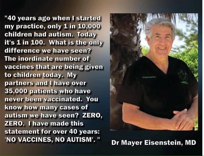 Keywords: anti vaccine vaccination vax disease health poison population control needle syringe 40 years ago when I started my practice, only 1 in 10,000 children had autism. Today it's 1 in 100. What is the only difference we have seen? The inordinate number of vaccines that are being given to children today. My partners and I who have never been vaccinated. You know how many cases of autism we have seen? Zero, Zero. I have made this statement for over 40 years. No vaccines, no autism. Dr. Mayer Eisentein, MD. Anti Vaccination meme collected by A.J. Wilson of iPressThis at FlatEarth.Online, made by others. 40 years ago when I started my practice, only 1 in 10,000 children had autism. Today it's 1 in 100. What is the only difference we have seen? The inordinate number of vaccines that are being given to children today. My partners and I who have never been vaccinated. You know how many cases of autism we have seen? Zero, Zero. I have made this statement for over 40 years. No vaccines, no autism. Dr. Mayer Eisentein, MD. Anti Vaccination meme collected by A.J. Wilson of iPressThis at FlatEarth.Online, made by others. |