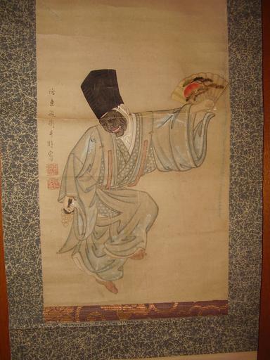 | Keywords: Noh.performer.manzai.zu.wittig.collection.painting.08.detail.01.jpg en Detail view of a painting of a noh performer masked playing a manzai comedy role possibly as a part of traditional Japanese new year celebrations manzai zu ; signed sealed as by Gion Seitoku dates of birth death given as either 1755 - after 1815 OR 1781-1829; unclear if dates are for the same person or not - more research needed ; private collection fam wittig et cie - painting 08 photograph of painting after 1829 or earlier PD-old-100 image set of painting ORIGINAL UPLOAD VERSION OF FILE please do not overwrite Image could be improved by photoediting; slight rotation to true vertical prespective correction cropping colour adjustment etc Gion Seitoku Manzai comedy Paintings on scrolls from Japan Nō Nō masks Source photograph of painting |
