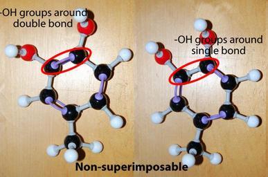 Keywords: Non-superimposability-of-2oh.png Image of the molecular model of 4-methyl benzene-1 2-diol showing the non-superimposability of the Kekule model of the benzene ring Note that in real life these isomers would be absolutely identical due to the fact that the benzene ring is actually a dislocalised pi bond 2008-05-06 own assumed Pylori Stereochemistry Catechols |