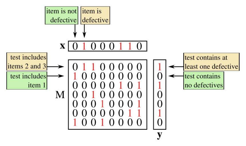 | Keywords: Nonadaptive Group Testing.svg en A typical group testing setup A non-adaptive algorithm first chooses the matrix M and is then given the vector y The problem is then to find an estimate for x 2016-10-19 own CheCheDaWaff other versions cc-zero Matrix Statistics Combinatorics |