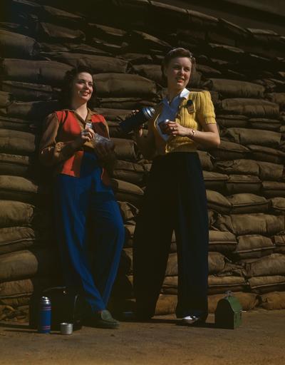 | Keywords: NoonDayRestWomenAlfredTPalmer.jpg en Lunchtime brings a few minutes of rest for these women workers of the assembly line at Douglas Aircraft Company's plant Long Beach Calif Sand bags for protection against air raid form the background LOC-image fsac 1a35335 Creator Alfred T Palmer 1942-10 PD-USGov Women at work in California Photographs by Alfred T Palmer at the Douglas Aircraft Plant in Long Beach California October 1942 Women at work in the United States in World War II Fashion in 1942 Standing women World War II color photographs of the US Homefront |