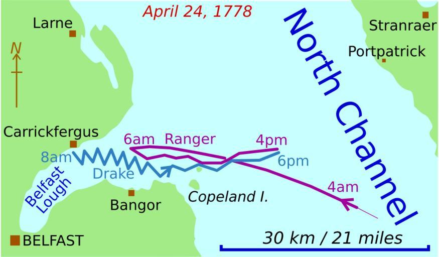 Keywords: North-Channel-Naval-Duel.svg en The movements of the opposing vessels in the hours before the North Channel Naval Duel 1778 own David Trochos 2008-07-09 Naval battles of the American Revolutionary War Maps of naval battles 1778 Military history of the United Kingdom Royal Navy Maps of battles of the United Kingdom |