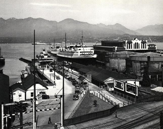 | Keywords: outdoor The North Vancouver Ferry dock on Vancouver's waterfront at the foot of Columbia Street in 1936. Prior to the opening of the Lions' Gate Bridge in 1939, this was the fastest way to reach the North Shore. The service ceased in 1958. The Canadian National Steamship terminal (1931) and dock (formerly the Grand Trunk Pacific dock) is seen in the upper right. [Vancouver Public Library; Photographer unknown] The North Vancouver Ferry dock on Vancouver's waterfront at the foot of Columbia Street in 1936. Prior to the opening of the Lions' Gate Bridge in 1939, this was the fastest way to reach the North Shore. The service ceased in 1958. The Canadian National Steamship terminal (1931) and dock (formerly the Grand Trunk Pacific dock) is seen in the upper right. [Vancouver Public Library; Photographer unknown] |