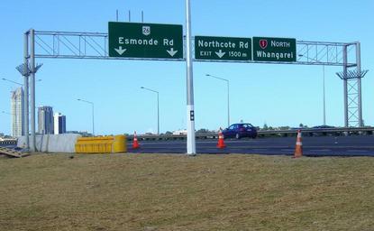| Keywords: Northern Motorway1.JPG Auckland's Northern Motorway taken near the Esmonde Road offramp to Takapuna own 2007-12-02 Follash Advance exit highway signs in New Zealand State Highway 1 New Zealand Transport infrastructure in Auckland Road sign gantries in New Zealand Crash barriers in New Zealand Crash barrier terminals |