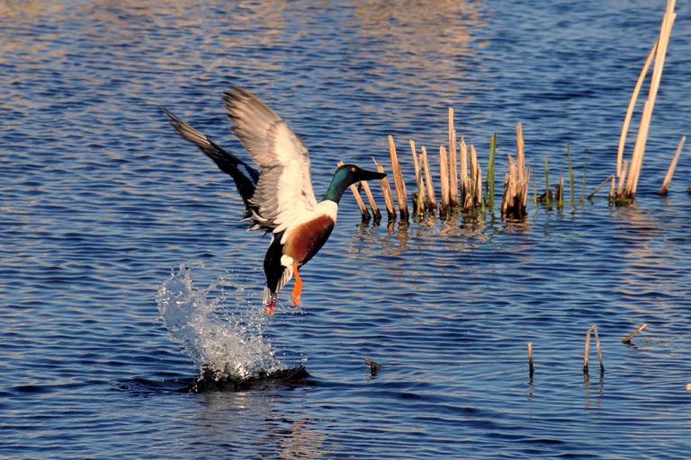Keywords: northern shoveler drake duck bird waterfowl flying water flight male wildlife nature pond lake