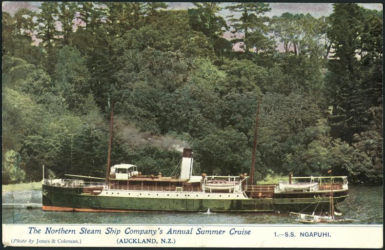 Keywords: outdoor Shows the S S Ngapuhi berthed at a low pier, with bush in the background. The National Maritime Museum website says: "The Summer Cruise began Friday night and went through to the next Saturday and cost 7 pounds. The first summer cruise was held in 1904 and they continued until 1908. They were truly the high point of the summer, combining picturesque scenery with activities, excellent food and entertainment. On-board facilities included a library and a darkroom for processing photographs. The NGAPUHI was used for this venture, normally on the Whangarei run carrying passengers and cargo, but spruced up in preparation for the Summer Cruise. The cruise took in Great Barrier, the Hen & Chicken Islands, Whangarei, (including trips to Whangarei Falls and the Kamo Mineral Pools), the Bay of Islands, Whangaroa Harbour, Totara North, Mangonui, Doubtless Bay, Kawau Island, Waiwera and home again". Quantity: 1 colour photo-mechanical print(s) on postcard. Physical Description: Oleograph on postcard, 89 x 138 mm. Northern Steam Ship Company Ltd. Northern Steam Ship Company :The Northern Steam Ship Company's annual summer cruise. 1.- SS Ngapuhi. Photo by Jones & Coleman (Auckland, N.Z. [Postcard].. Ref: Eph-A-SHIP-1907-01. Alexander Turnbull Library, Wellington, New Zealand. natlib.govt.nz/records/23025008 Shows the S S Ngapuhi berthed at a low pier, with bush in the background. The National Maritime Museum website says: "The Summer Cruise began Friday night and went through to the next Saturday and cost 7 pounds. The first summer cruise was held in 1904 and they continued until 1908. They were truly the high point of the summer, combining picturesque scenery with activities, excellent food and entertainment. On-board facilities included a library and a darkroom for processing photographs. The NGAPUHI was used for this venture, normally on the Whangarei run carrying passengers and cargo, but spruced up in preparation for the Summer Cruise. The cruise took in Great Barrier, the Hen & Chicken Islands, Whangarei, (including trips to Whangarei Falls and the Kamo Mineral Pools), the Bay of Islands, Whangaroa Harbour, Totara North, Mangonui, Doubtless Bay, Kawau Island, Waiwera and home again". Quantity: 1 colour photo-mechanical print(s) on postcard. Physical Description: Oleograph on postcard, 89 x 138 mm. Northern Steam Ship Company Ltd. Northern Steam Ship Company :The Northern Steam Ship Company's annual summer cruise. 1.- SS Ngapuhi. Photo by Jones & Coleman (Auckland, N.Z. [Postcard].. Ref: Eph-A-SHIP-1907-01. Alexander Turnbull Library, Wellington, New Zealand. natlib.govt.nz/records/23025008