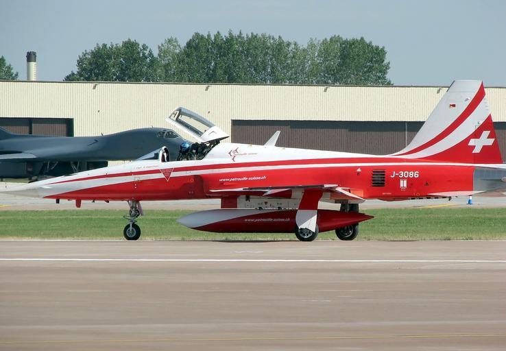 Keywords: Northrop.f-5e.tiger.2.ff2006.arp.jpg Northrop F-5E Tiger II J3086 of the Patrouille Suisse aerobatics team leaving the Royal International Air Tattoo Fairford Gloucestershire England to return home Beyond it is a B-1 Lancer Photographed by Adrian Pingstone on July 17th 2006 and released to the public domain 2006-09-05 own assumed Arpingstone Patrouille Suisse 2006 Royal International Air Tattoo |