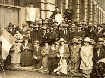 | Keywords: praying prayer vigil prayervigil kneeling rosary beads rosarybeads rosaries tricolours sacred heart sacredheart hats 1920s twenties w.d. hogan wdhogan hogan collection hogancollection caps trilby location identified locationidentified date established dateestablished downing street downingstreet london london sw1a 2aa londonsw1a2aa england united kingdom unitedkingdom u.k. uk irish war of independence irishwarofindependence treaty negotiations treatynegotiations truce thursday 14th july 1921 sinn féin sinnféin national library of ireland nationallibraryofireland monochrome We thought that this W.D. Hogan photograph was taken during the Irish Civil War. The title on our catalogue was: "A prayer vigil, during the Irish Civil War, possibly in London" - at least we were partly right! It had been suggested that this was taken in London, because it was stamped on the back with "Photo by The Press Photographic Agency, Johnson's Court, Fleet St., E.C.4.". Have to admit I wasn't initially convinced about London, but am absolutely happy to say that I was entirely wrong... Have a look through the comments below, to see how the location of Downing Street in London was established by our Fantastic Flickroonies, and hence an accurate date for this photo... So we've achieved two of our Triumvirate of Terrificness - Date established and Location identified. If we identify any of the people, I may faint away with happiness! :) Date: Thursday, 14 July 1921 (at approximately 17:30) NLI Ref.: HOG1 We thought that this W.D. Hogan photograph was taken during the Irish Civil War. The title on our catalogue was: "A prayer vigil, during the Irish Civil War, possibly in London" - at least we were partly right! It had been suggested that this was taken in London, because it was stamped on the back with "Photo by The Press Photographic Agency, Johnson's Court, Fleet St., E.C.4.". Have to admit I wasn't initially convinced about London, but am absolutely happy to say that I was entirely wrong... Have a look through the comments below, to see how the location of Downing Street in London was established by our Fantastic Flickroonies, and hence an accurate date for this photo... So we've achieved two of our Triumvirate of Terrificness - Date established and Location identified. If we identify any of the people, I may faint away with happiness! :) Date: Thursday, 14 July 1921 (at approximately 17:30) NLI Ref.: HOG1 |