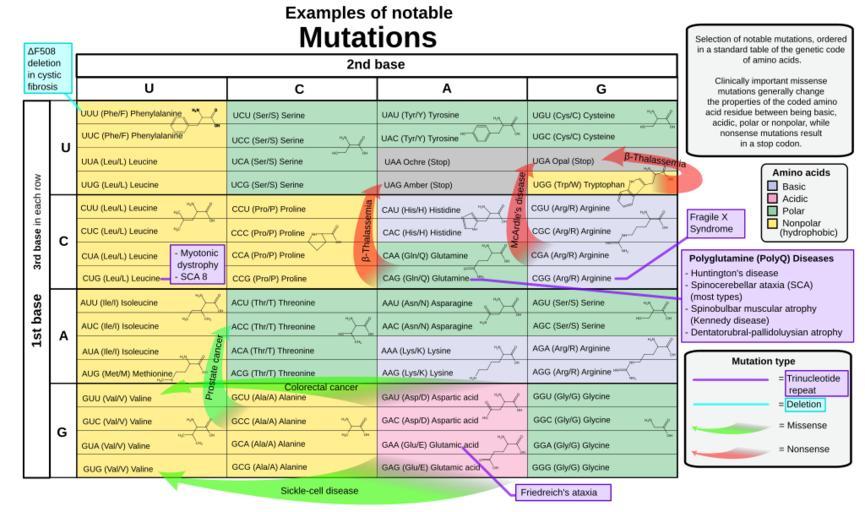 MAKE A MEME View Large Image Notable mutations.svg mutations ordered in a standard table of the genetic code of amino acids As can be seen clinically important missense mutations generally change the properties of the coded amino acid residue between being basic acidic ...
