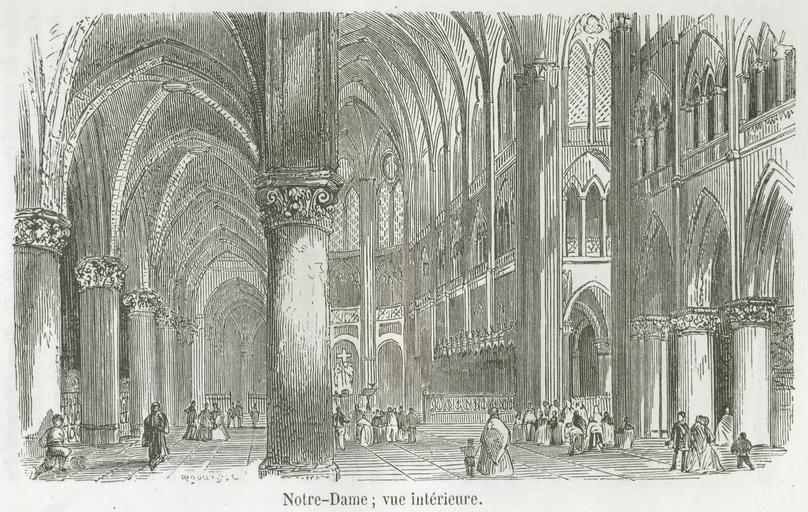 | Keywords: Notre-Dame, vue intérieure, 1855.jpg A view of the interior of the Cathedral of Notre-Dame on the Ile de la Cité in Paris 1855 engraving 6 3 x 10 5 cm Institution Brown University Library object history exhibition history credit line Published in Guide dans les monuments de Paris Paris Paulin et Le Chevalier 1855 accession number 1150468944266683 PD-old Interior of Notre-Dame de Paris in art 1855 Guide dans les monuments de Paris Images of Paris from the Brown University Library Notre-Dame de Paris in the 1850s |