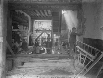 Keywords: phelan shop renovations carpenters plasterers saw plane shelving workers girders henderson & glass, liverpool hendersonglassliverpool henderson & glass hendersonglass ireland november 1921 1920s twenties great georges street greatgeorgesstreet poole collection poolecollection glass negative glassnegative a.h. poole ahpoole arthur henri poole arthurhenripoole waterford warehouses national library of ireland nationallibraryofireland blackandwhite monochrome alley black and white Major renovations taking place at a shop (we think) on Great George's Street, Waterford. Although whatever was going on with the extension or renovation, it looks as if it was still more or less business as usual, with products still on the shelves and men working away in the warehouse area at the back. All the carpenters and plasterers in the foreground are slightly blurry because they're working away, but it looks as if the boy to the left was making the most of being in this photo... The photo was commissioned by a Mr Phelan. Date: 17 November 1921 NLI Ref.: P_WP_2968 Major renovations taking place at a shop (we think) on Great George's Street, Waterford. Although whatever was going on with the extension or renovation, it looks as if it was still more or less business as usual, with products still on the shelves and men working away in the warehouse area at the back. All the carpenters and plasterers in the foreground are slightly blurry because they're working away, but it looks as if the boy to the left was making the most of being in this photo... The photo was commissioned by a Mr Phelan. Date: 17 November 1921 NLI Ref.: P_WP_2968 |