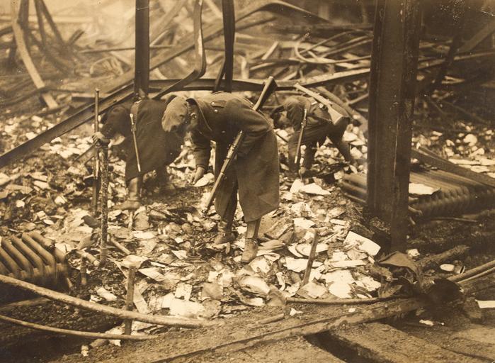 | Keywords: national army nationalarmy soldiers troops fire rotunda rink rotundarink parnell square parnellsquare dublin ireland sorting office sortingoffice general post office generalpostoffice g.p.o. gpo rubble radiators uniforms rifles armed raid armedraid arson november 1922 1920s irish civil war irishcivilwar w.d. hogan wdhogan hogan collection hogancollection national library of ireland nationallibraryofireland sunday 5th 20th century 20thcentury outdoor monochrome National Army soldiers searching through the remains of a fire at the Rotunda Rink, Parnell Square, which was the sorting office of the General Post Office, Dublin. The Irish Times of Monday, 6 November 1922 contained this report of the event: "The Rotunda Rink Post Office, Dublin, was destroyed by fire yesterday morning. At about 6.40 o'clock armed men compelled a watchman to admit them at the western gate. The officials on duty were ordered into a small room, and later were escorted into Lower Dominick street, when they were instructed to walk towards the Broadstone Station. In the meanwhile, other men entered the Rink with tins of petrol, with which they saturated the floors, and, when their preparations were complete, set the place on fire. Within an hour, despite the efforts of the fire brigade to extinguish the flames, the Rink was a mass of smouldering ashes and twisted ironwork. The destruction of the Rink has resulted in the loss of a great quantity of correspondence. There will be only two deliveries in the city today, but to-morrow there will be three. The postal authorities, apparently, intend to use Banba Hall as a temporary sorting office." Date: Sunday, 5 November 1922 NLI Ref.: HOG104 National Army soldiers searching through the remains of a fire at the Rotunda Rink, Parnell Square, which was the sorting office of the General Post Office, Dublin. The Irish Times of Monday, 6 November 1922 contained this report of the event: "The Rotunda Rink Post Office, Dublin, was destroyed by fire yesterday morning. At about 6.40 o'clock armed men compelled a watchman to admit them at the western gate. The officials on duty were ordered into a small room, and later were escorted into Lower Dominick street, when they were instructed to walk towards the Broadstone Station. In the meanwhile, other men entered the Rink with tins of petrol, with which they saturated the floors, and, when their preparations were complete, set the place on fire. Within an hour, despite the efforts of the fire brigade to extinguish the flames, the Rink was a mass of smouldering ashes and twisted ironwork. The destruction of the Rink has resulted in the loss of a great quantity of correspondence. There will be only two deliveries in the city today, but to-morrow there will be three. The postal authorities, apparently, intend to use Banba Hall as a temporary sorting office." Date: Sunday, 5 November 1922 NLI Ref.: HOG104 |