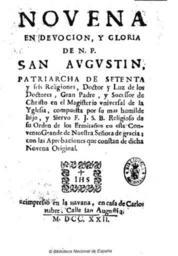 Keywords: Novena en devocion 1722.jpg es Novena en devoción y gloria de N P San Augustin Texto impreso / compuesta por F J S B Religioso de su Orden de los Ermitaños - Reimpresso en la Havana en casa de Carlos Habre 1722 - 4 43 p ; 4º Signatura 2/1845 1722 http //bdh bne es/bnesearch/detalle/bdh0000107670 - Biblioteca Digital Hispánica Biblioteca Nacional de España F J S B Religioso de Su Orden de los Ermitaños other versions BNE PD-old-100 Uploaded with UploadWizard Spanish language |
