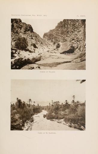 | Keywords: NovitatesZoologicae18 Pl18.png en Above Gorges de Tilatou Djebel Metlili Batna Province Algeria Coordinates are tentative Location “ looking southwest 35 19 00 N 05 46 35 E heading SW ---- en Below Oasis of El Kantara Algeria Coordinates are tentative Location “ looking south 35 13 41 N 05 42 17 E heading S Novitates Zoologicae http //www archive org/details/novitateszoologi18lond Volume 18 Plate 18 February-April 1908 February/March 1909 or March 1911 photos taken 1912 published Walter Rothschild Ernst Hartert K Jordan editors PD-old Novitates Zoologicae - volume 18 Nature of Algeria Tilatou El Kantara French Algeria |
