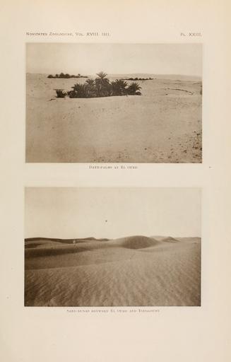 | Keywords: NovitatesZoologicae18 Pl23.png  en Above Date Palm plantings in the oasis of El Oued Algeria<br /> Below Sand dunes between El Oued and Touggourt Algeria Novitates Zoologicae http //www archive org/details/novitateszoologi18lond Volume 18 Plate 23 6-11 April 1909 upper photo taken 4-7 or 10-13 April 1909 lower photo taken 1912 published Walter Rothschild Ernst Hartert K Jordan editors PD-old-100 Novitates Zoologicae - volume 18 Nature of Algeria Flora of Algeria Flora of South Algeria El Oued French Algeria Phoenix dactylifera illustrations Dunes of Algeria 1909 photographs Algeria in the 1900s |