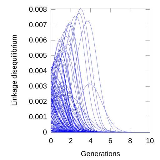 Keywords: Nrm ld.svg en Plot of 1 024 trajectories of linkage disequilibrium in a two-locus two-allele model of positive assortative mating own Trashbird1240 Biology diagrams Genetics Evolution