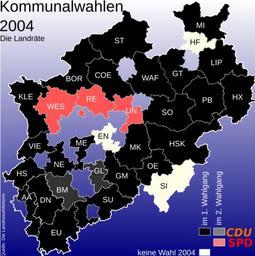 | Keywords: NRW election 2004 Landrat.svg  North Rhine-Westfalia showing the party of the elected landrat district chief executive Nordrhein-Westfalen Gezeigt ist die Parteizugehörigkeit des gewählten Landrates own Vinom 2009-03-24 Mein Geschenk an die Welt Basiert auf 100px Local elections in North Rhine-Westphalia 2004 |