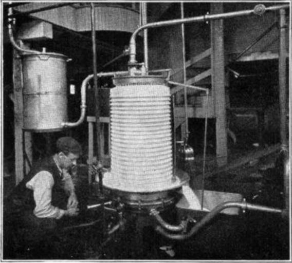 | Keywords: NSRW Dairy Industry 5.jpg <small>Copyright Brown Bros </small> FILTER AND PASTEURIZER The milk is next carried to a Pasteurizer First it passes through the filter which is the upper can on the left of the picture It then passes to the Pasteurizer which you see in the center of the picture It is first warmed by being allowed to run down over the outside of the Pasteurizer and it is then forced up through the interior which contains a steam coil where it is heated to 162° Fahr This kills the germs and makes it possible to keep the milk sweet for a week It is then carried through a pipe at the top of the Pasteurizer to the cooler Next >> Image LA2-NSRW-3-0230 jpg Pasteurization |
