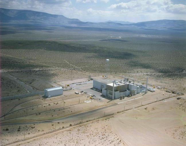 | Keywords: NTS - EMAD Facility 001.jpg en The Engine Maintenance Assembly and Disassembly E-MAD Building was built to assemble and disassemble experimental nuclear powered rocket engines The engines were tested in southwest-corner of the Nevada Test Site That program ended in 1973 Radioactive waste storage investigations also have been conducted at E-MAD including the canning of spent nuclear fuel elements The E-MAD building is 80 feet high and has 100 000 square feet of floor space Hot bay access by railcar or truck is through a 22-foot-wide 37-foot-high doorway The shielded door is made of concrete five feet thick 1284 WA-560 Federal Government of the United States 36 806459 -116 304649 PD-USGov NRDS E-MAD Water towers in Nevada |