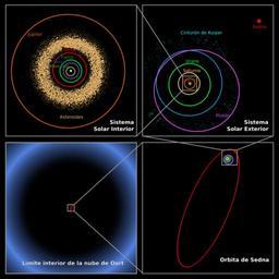 | Keywords: Nube de Oort.svg trans-Neptunian object 90377 Sedna which lies in the farthest reaches of the Solar system <ref>http //www spitzer caltech edu/Media/releases/ssc2004-05/release shtml Most Distant Object in Solar System Discovered Press release Jet Propulsion Laboratory March 15 2004 </ref> Each panel moving clockwise from the upper left successively zooms out to place Sedna in context The first panel shows the orbits of the inner planets and Jupiter; and the asteroid belt In the second panel Sedna is shown well outside the orbits of Neptune and the Kuiper belt objects Sedna's full orbit is illustrated in the third panel along with the object's location in 2004 nearing its closest approach to the Sun The final panel zooms out much farther showing that even this large elliptical orbit falls inside what was previously thought to be the inner edge of the spherical Oort cloud a distribution of cold icy bodies lying at the limits of the Sun's gravitational pull Sedna's presence suggests that the previously speculated inner disk on the ecliptic does exist translated from http //commons wikimedia org/wiki/Image Oort_cloud_Sedna_orbit svg Holek translated by Rage against 2008-09-01 Other fields + 1 File Oort cloud Sedna orbit-es svg The other archive is a better translation Sedna Oort cloud |