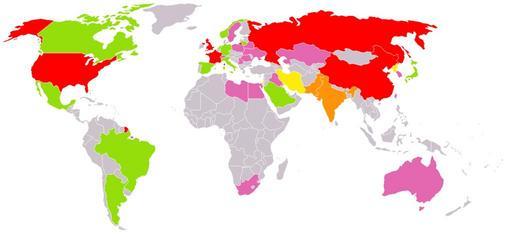 Keywords: Nuclear weapon programs worldwide 2.png Image of worldwide nuclear weapons programs as of September 2005 Based on info at en List of countries with nuclear weapons filled into Image BlankMap-World png originally by User Fastfission but now by others as well see below Rendered without labels for multi-lingual support Feel free to update this very easy using Photoshop or GIMP as reliable information changes <font color ED2024 >Rojo</font> Five nuclear weapons states from the NPT <font color FF940A >Anaranjado</font> Other known nuclear powers <font color ffff00 >Amarillo</font> States suspected of having possession of or suspected of being in the process of developing nuclear weapons and/or nuclear programs <font color E368B0 >Morado</font> States which at one point had nuclear weapons and/or nuclear weapons research programs <font color 7cfc00 >Verde</font> Other states capable of developing nuclear weapons Historical states have been represented by their successor states i e Yugoslavia by Serbia and Montenegro as they apparently inherited the nuclear materials of the socialist state after it fragmented 2006-08-05 own assumed Robotico Distributional maps of the world Nuclear proliferation Maps needing South Sudan political boundaries |