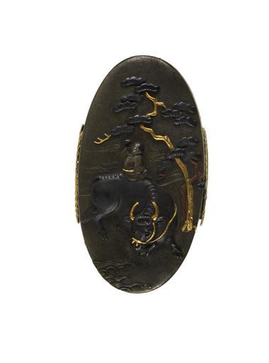 | Keywords: Nukagawa Yasunori - Kashira with a Boy Riding an Ox - Walters 51983.jpg A boy is depicted seated on an ox beneath a pine tree The shore can be seen behind him This many be a reference to the Buddhist journey towards enlightenment A series of ten images of a boy and an ox were used to illustrate the process of attaining enlightenment This is part of a set with Walters 51 982 ~ 1800 Edo silver copper gold cm 3 1 l accession number 51 983 35292 William T / Henry Walters Collection Baltimore date and mode of acquisition unknown Walters Art Museum Henry Walters Acquired by William T or Henry Walters none place of origin Mito Japan Walters Art Museum license Kashira in the Walters Art Museum Nukagawa Yasunori Media contributed by the Walters Art Museum needs category review |