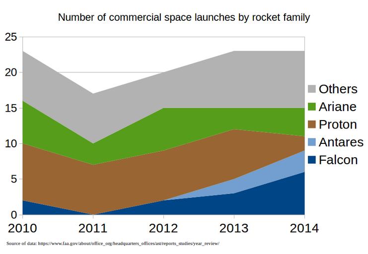 | Keywords: Number of commercial space launches by rocket family.png en Number of commercial space launches by rocket family Source of the data https //www faa gov/about/office_org/headquarters_offices/ast/reports_studies/year_review/ Federal Aviation Administration Commercial Space Transportation Year in Review <br> Commercial launch is https //www faa gov/about/office_org/headquarters_offices/ast/media/2006YIR pdf defined by the FAA as a launch that is internationally competed or FAA-licensed or privately-financed launch activity Demonstration launches are not counted <br> In the others category are Dnepr PSLV Soyuz Zenit Atlas Delta Minotaur Rockot and Long March families None of them made more than 2 commercial launches in 2014 see the data section below ru ΠΠ·ΠΌΠ΅Π½Π΅Π½ΠΈΡ Π½Π° Ρ ΡΠ½ΠΊΠ΅ ΠΊΠΎΠΌΠΌΠ΅Ρ ΡΠ΅ΡΠΊΠΈΡ