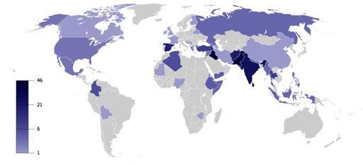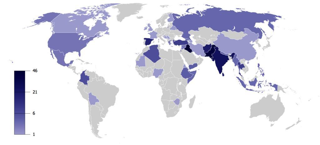 Keywords: Number of terrorist incidents 2008.png Terrorist Incidents 2008 svg en Number of terrorist incidents for 2008 according an article on the English Wikipedia Based on the Wikipedia List of terrorist incidents 2008 Emilfaro en 2009-02-08 GunnMap <gallery> File Terrorist Incidents 2008 svg SVG version File Number of Terrorist Incidents png 2000-2008 </gallery> The data wikitable Iraq 46 - Pakistan 42 - Spain 33 - India 55 - Afghanistan 20 - Sri Lanka 17 - Israel 12 - Thailand 9 - Turkey 9 - Algeria 6 - Colombia 6 - Ethiopia 4 - Lebanon 4 - Yemen 4 - Burma 3 - Georgia 3 - Indonesia 3 - Nepal 3 - Philippines 3 - Russia 3 - Somalia 3 - Greece 2 - Mexico 2 - Syria 2 - US 2 - Azerbaijan 1 - Belarus 1 - Bolivia 1 - Bosnia and Herzegovina 1 - Canada 1 - China 1 - Croatia 1 - Eritrea 1 - Finland 1 - France 1 - Iran 1 - Ireland 1 - Mauritania 1 - Nigeria 1 - Serbia 1 - UK 1 - Zimbabwe 1 Terrorist incidents 2008 maps