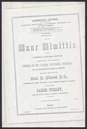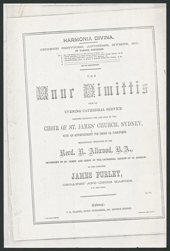 | Keywords: Nunc dimittis.jpg  en Cover page of Nunc dimittis music by James Furley organist and choir master of St James' Church Sydney 1860 http //nla gov au/nla mus-vn5715925 James Furley Composed expressly for and sung by the choir of St James' Church Sydney with an accompaniment for organ or pianoforte by the composer James Furley organist and choir master of St James' Church music Furley James 1831-1912 From an evening cathedral service Custom license marker 2014 01 14 PD-Aus PD-old Uploaded with UploadWizard St James' Church Sydney Sheet music Choirs History of Sydney Nunc dimittis |