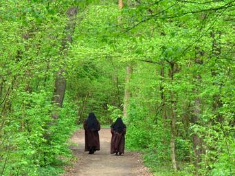 Keywords: nuns spacer spring green forest conversation prayer way the path