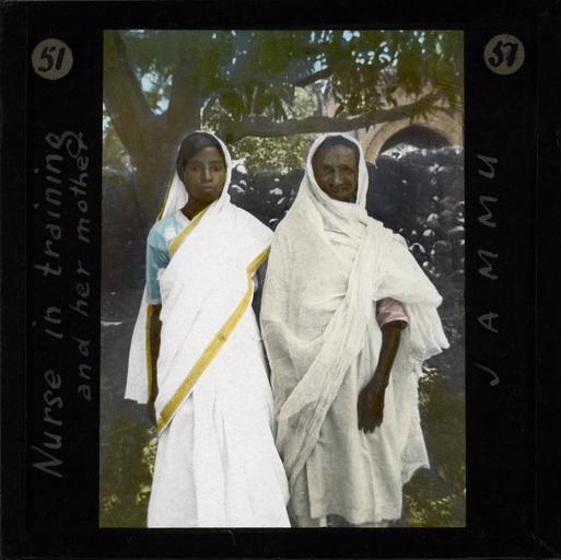 Keywords: Nurse in training and her mother, Jammu, ca.1875-ca.1940 (imp-cswc-GB-237-CSWC47-LS10-051).jpg en <br> Nurse in training and her mother Jammu ca 1875-ca 1940 Photograph of a young Indian girl a nurse in training and her mother The pair are pictured standing outside under a tree and there is a stone wall in the background ; This belongs to a series of Church of Scotland Foreign Missions Committee lantern slides relating to Jammu City which is also known as the City of Temples A mission station occupied by Church of Scotland missionaries was founded here in the late 19th/early 20th century Jammu is also one of the three administrative divisions within Jammu and Kashmir the northernmost state in India Photographer Unknown Filename imp-cswc-GB-237-CSWC47-LS10-051 tif Coverage date 1875/1940 Part of collection International Mission Photography Archive ca 1860-ca 1960 Geographic subject region Jammu and Kashmir Type images Part of subcollection Photographs from the Centre for the Study of World Christianity University of Edinburgh U K ca 1900-ca 1940s Repository name Centre for the Study of World Christianity Archival file impaunpub_Volume7/1768 url Repository address The University of Edinburgh School of Divinity New College Mound Place Edinburgh EH1 2LX United Kingdom Geographic subject country India Format aacr2 1 lantern slide 8 x 8 cm Geographic subject continent Asia Rights Contact the repository for details Part of series In the Temple City of Jammu LS10 Repository email divinity-CSWC ed ac uk Subject lcsh Keyword Nursing; Education Date created 1875/1940 Publisher of the digital version University of Southern California Libraries Subject aat genre portraits Format aat lantern slides Legacy record ID impa-m69319 Access conditions http //www ed ac uk/schools-departments/divinity/research/centres/world-christianity/collections-resources File GB 237 CSWC47/LS10/51 1875/1940 author http //digitallibrary usc edu/cdm/ref/collection/p15799coll123/id/64885 PD-old-70-1923 Magic lantern images Images from USC Digital Library uploaded by Fæ International Mission Photography Archive ca 1860-ca 1960 People of Jammu Women wearing saris |